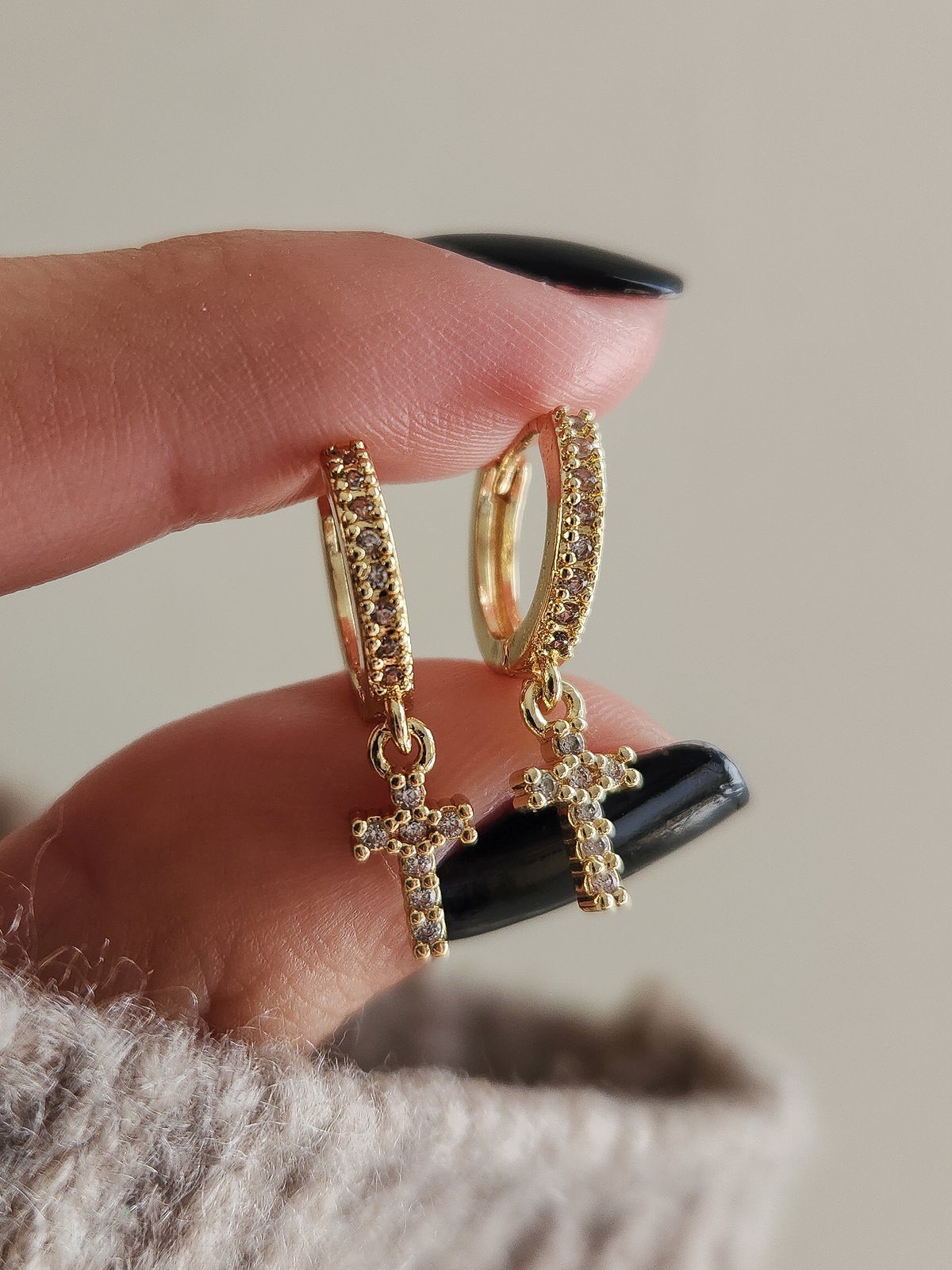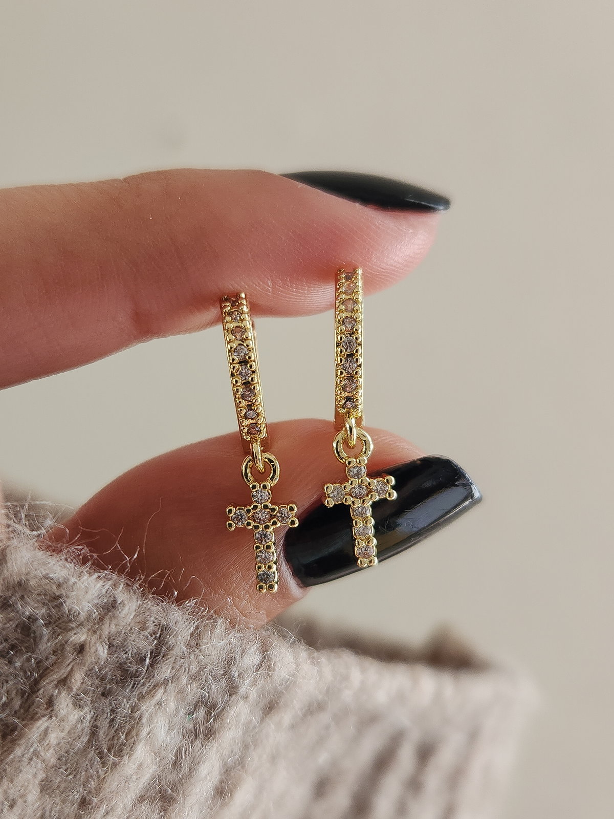Un símbolo eterno con un diseño de vanguardia. Nuestras argollas Cruz de 1.2 cm destacan por su sofisticada combinación de texturas: el frente de la argolla está sutilmente recubierto de strass, rematando con un dije de cruz también engarzado que captura la luz con cada gesto. Confeccionadas en bronce dorado, son la pieza ideal para quienes buscan un accesorio "premium" que combine protección y elegancia.