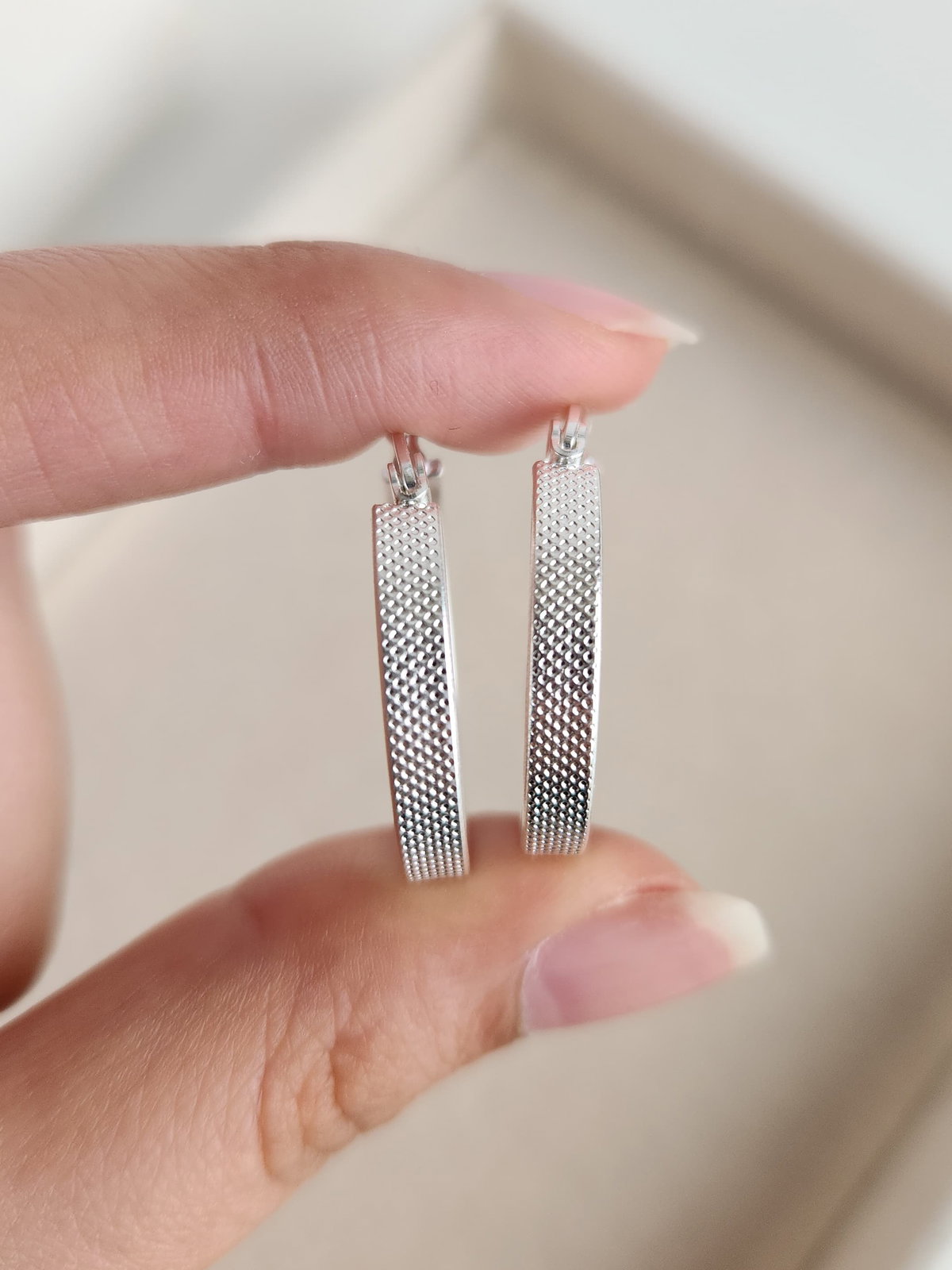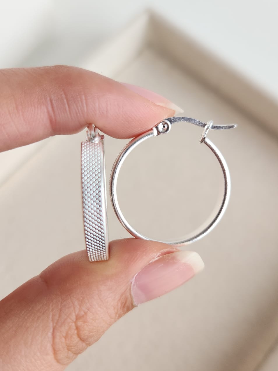 La magia del diamantado es que brilla por sí solo. Estas argollas captan la luz natural y artificial de forma mucho más intensa que una pieza lisa, logrando un efecto de "luz propia" que realza las facciones. Al ser de acero blanco, mantienen esa blancura gélida que tanto destaca. Son la elección número uno para eventos donde querés brillar con sutileza o para darle un "upgrade" inmediato a tu look de diario.
