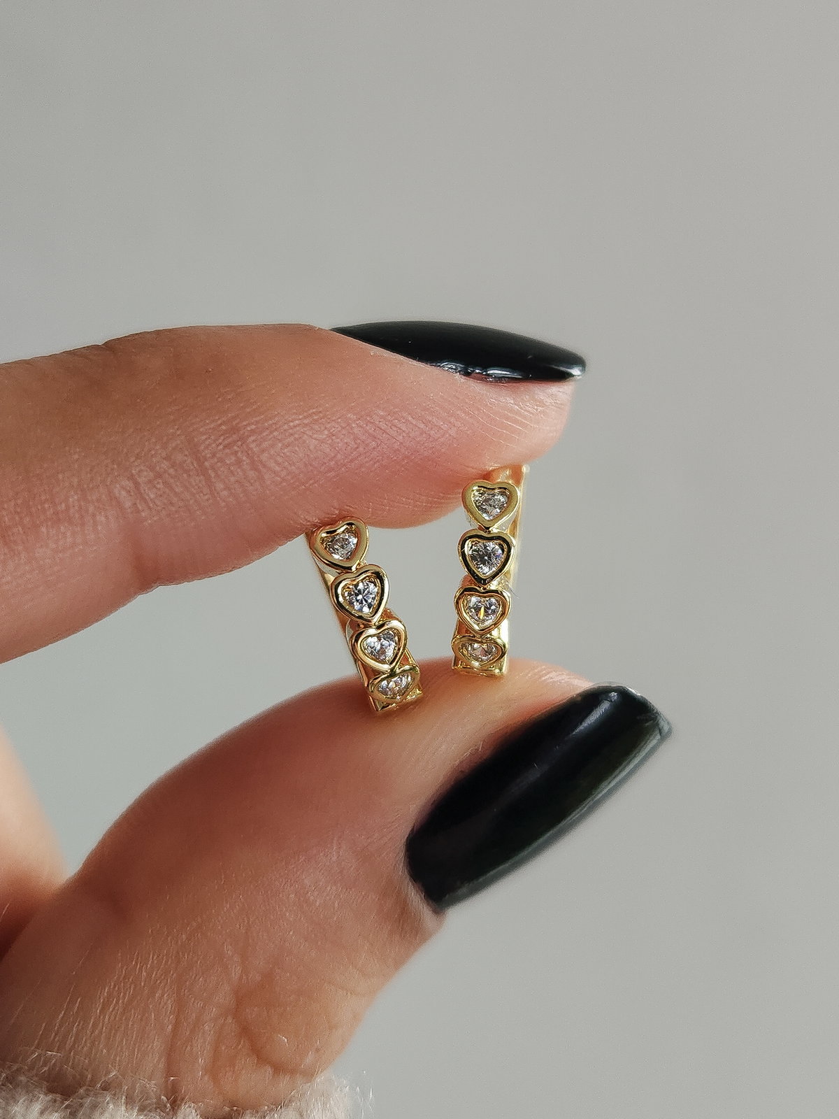 La sutileza hecha joya. Nuestras argollas Mini Heart de 1 cm son pequeñas piezas de diseño pensadas para quienes aman los detalles delicados. Confeccionadas en bronce con baño oro, cuenta con corazones en cubic transparente, facetado para capturar y reflejar la luz con la pureza de un diamante.