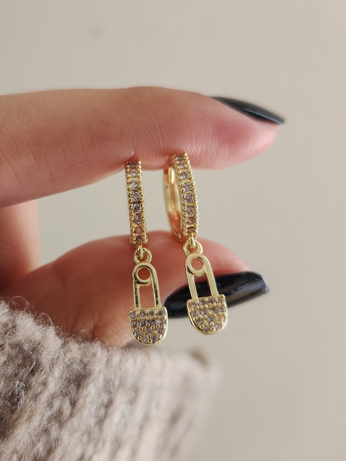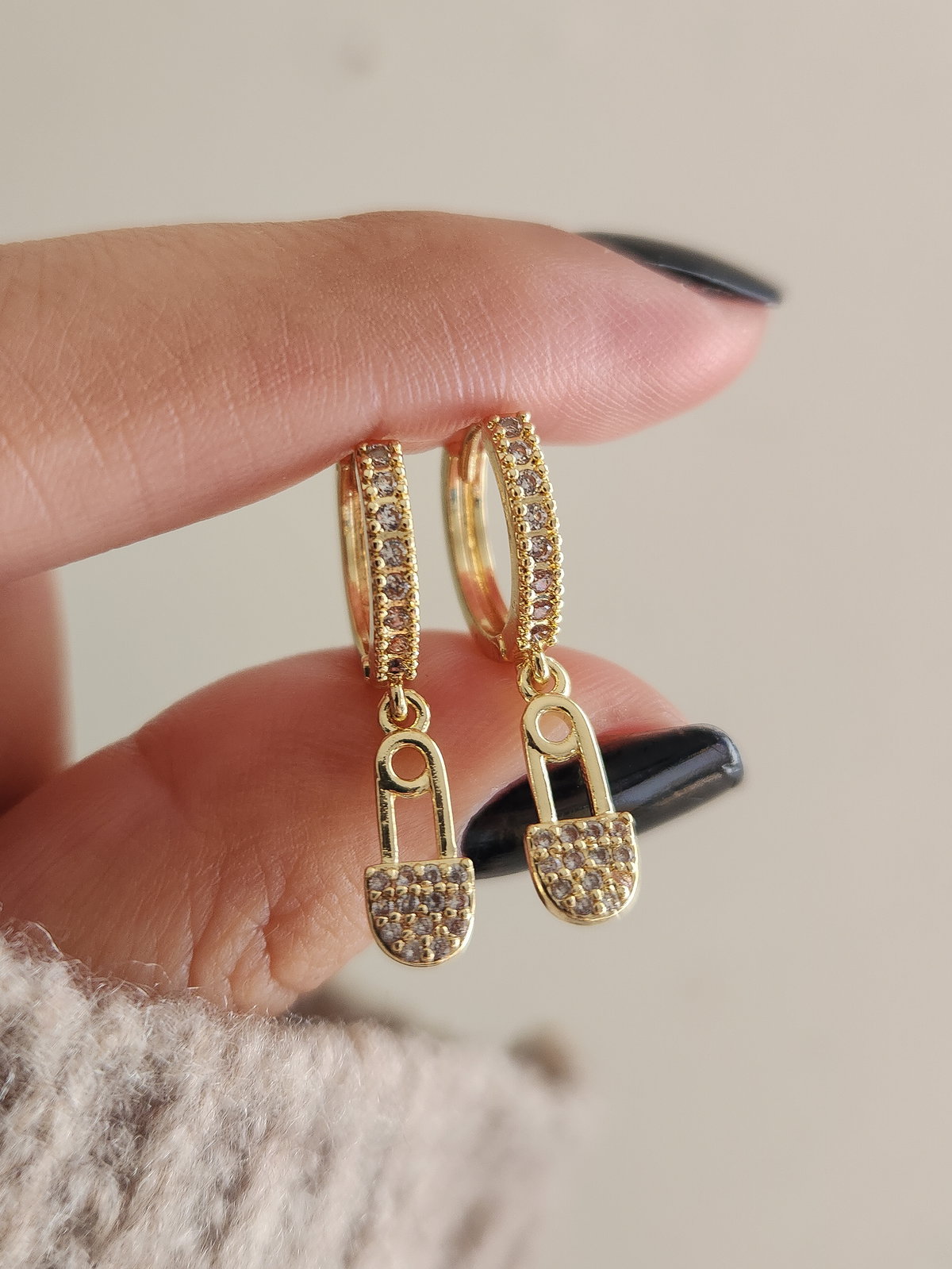 Audacia con un acabado de lujo. Nuestras argollas Surez reinventan un símbolo cotidiano para transformarlo en una joya de alto impacto. Confeccionadas en bronce con baño dorado, estas argollas están delicadamente recubiertas de strass, sosteniendo un dije de ganchito de 1.3 cm íntegramente trabajado en micro-pavé de cristales.