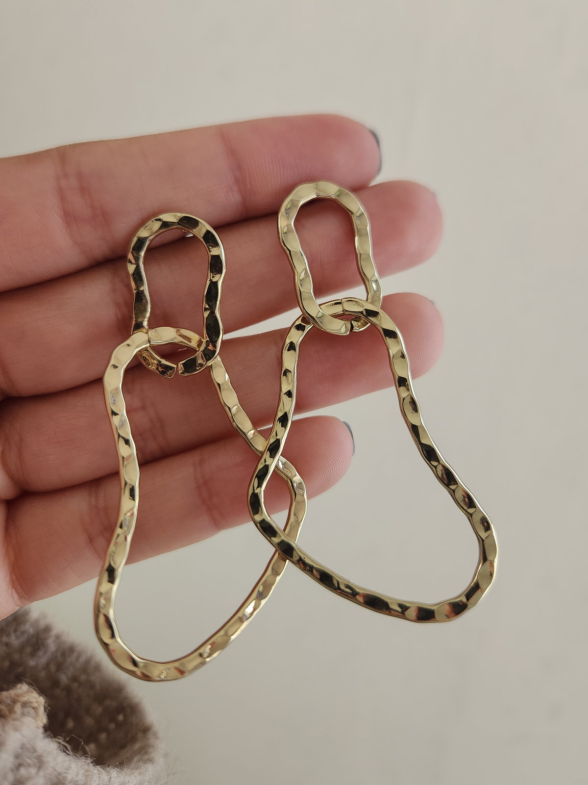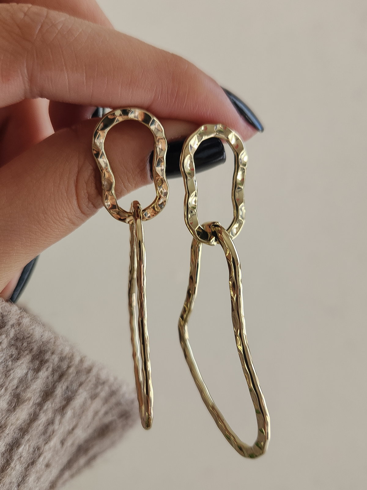 Descubrí la belleza de lo imperfecto. Nuestros aros pasantes Trinnie destacan por su diseño calado en forma de gota alargada, confeccionado en acero dorado. El metal presenta una cautivadora textura martillada que contrasta dinámicamente con una delicada línea que recorre parte del diseño, logrando un brillo sofisticado y lleno de matices.