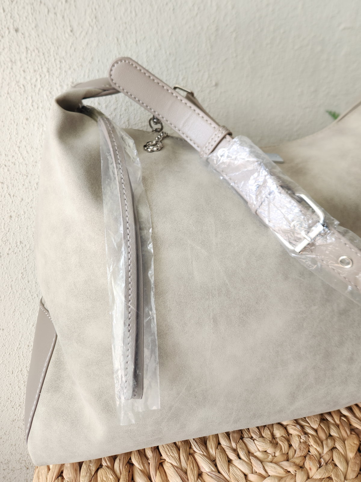 El bolso definitivo para la mujer que lleva su mundo consigo. Nuestro Maxi Tote Nordica destaca por su imponente tamaño de $40 \times 36$ cm y su sofisticado acabado en gris neutro. Diseñado para ser funcional sin perder la elegancia, incorpora un cierre exterior anti-robo que te permite transitar la ciudad con total tranquilidad. Su estructura de compartimento único maximiza el espacio, mientras que los detalles en herrajes plateados le dan una terminación moderna y limpia.