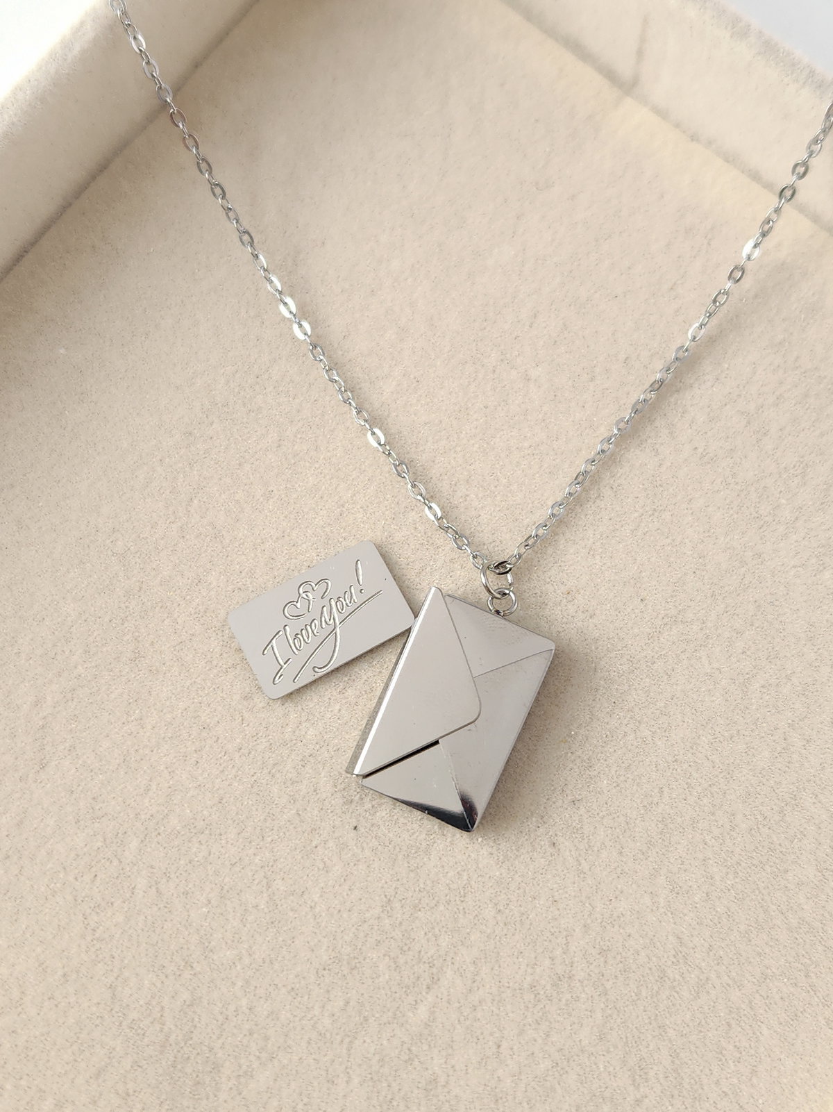 Llevá un mensaje de amor siempre cerca del corazón con nuestro collar. Esta pieza de ingeniería delicada presenta un dije en forma de sobre de carta con un sistema imantado que permite abrirlo para revelar una placa oculta con la frase grabada: "I Love You".