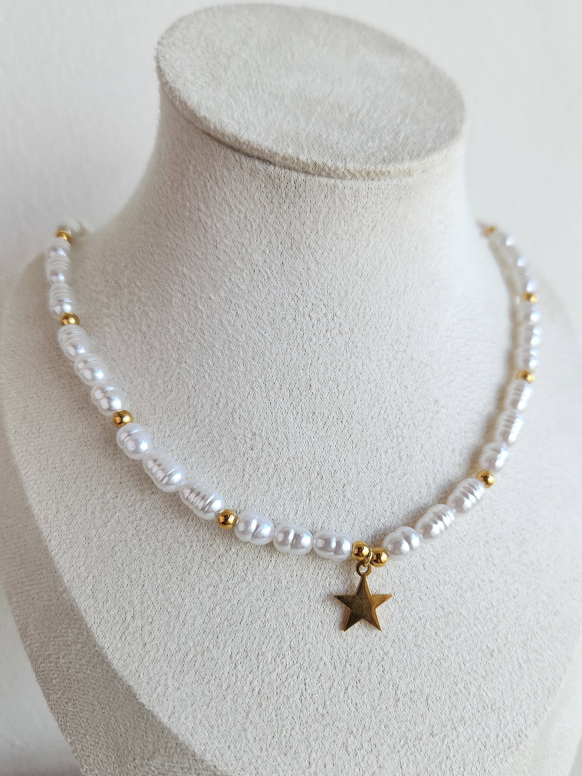 Capturá la luz del cielo y el mar en una sola pieza. Nuestro collar Astral Pearl es una composición delicada y equilibrada de perlas de río (símil) intercaladas con sutiles bolitas doradas que aportan destellos de luz constantes. El diseño se corona con un dije de estrella central, simbolizando la guía y el brillo propio.