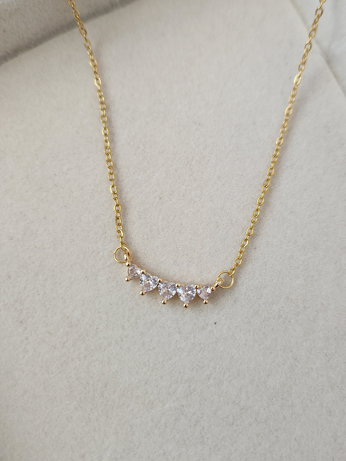 Llevá el romanticismo a otro nivel con nuestro collar Heart cubic. Esta pieza en acero dorado presenta cinco delicados dijes de corazón distribuidos a lo largo de la cadena, cada uno engarzado con un Cubic Zirconia premium. Es un diseño pensado para quienes aman los símbolos clásicos pero con un giro moderno y lujoso.