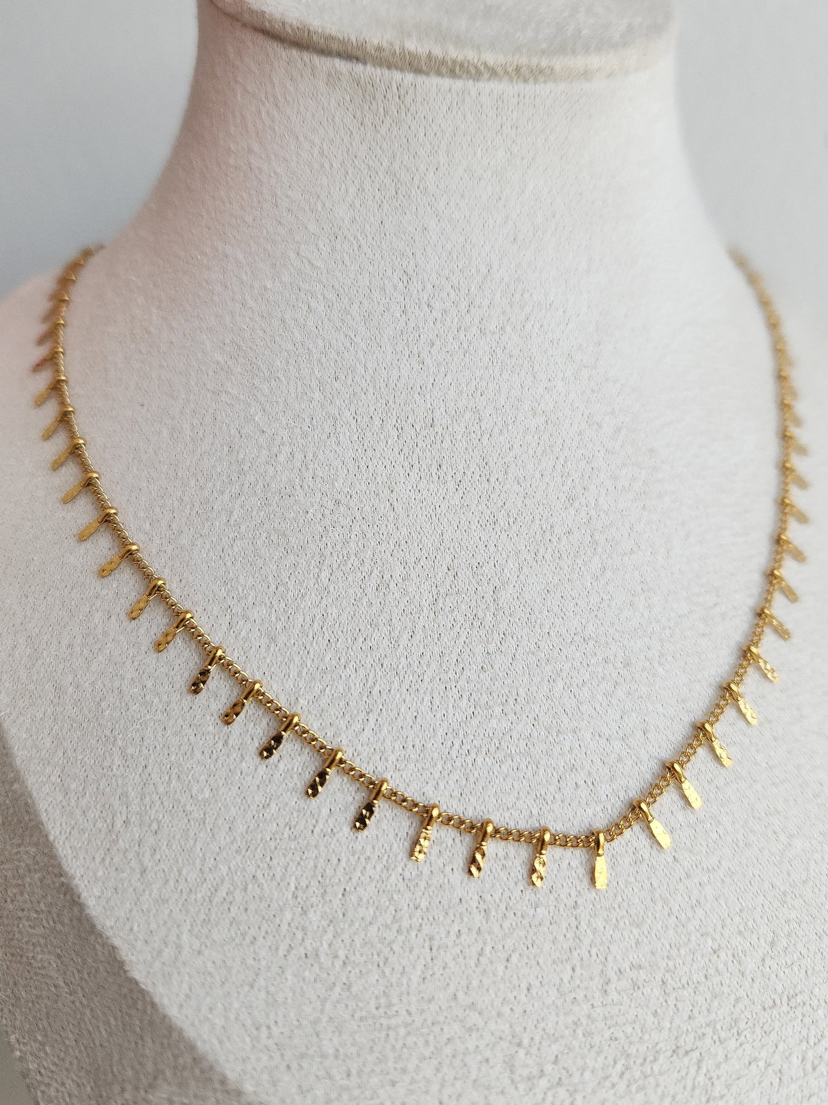 Capturá todas las miradas con nuestro collar Kenia. Esta pieza de acero dorado destaca por su diseño de cadena adornada con múltiples dijes rectangulares pequeños distribuidos rítmicamente. Cada chapita tiene un acabado facetado o martillado que refleja la luz con cada movimiento, creando un efecto de "brillo líquido" sobre tu piel.