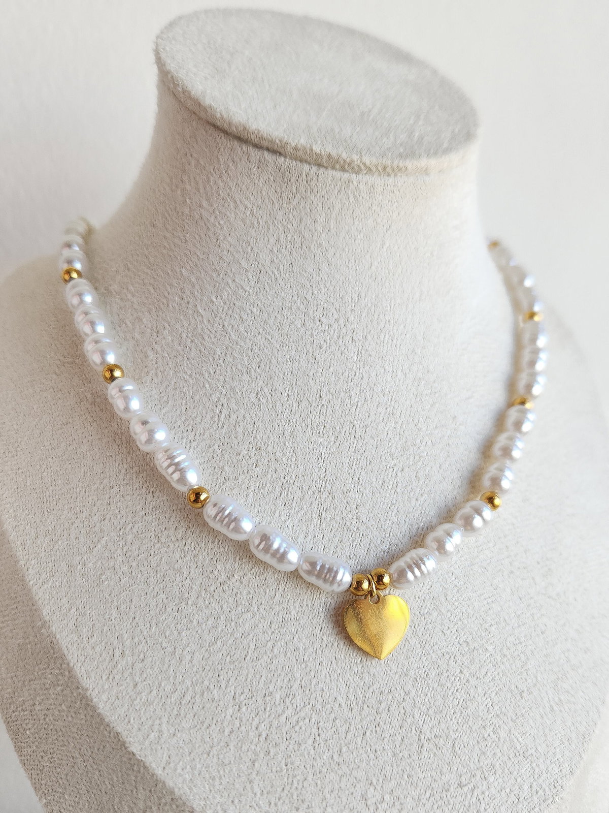 Redescubrí el romanticismo con una pieza que une dos clásicos inolvidables: la pureza de las perlas de río (símil) y la calidez del oro. Nuestro collar destaca por su hilera de perlas perfectamente seleccionadas, interrumpidas rítmicamente por bolitas doradas que le dan un aire contemporáneo. El protagonista es un dije de corazón central en acero dorado que sella este diseño con pura elegancia.
