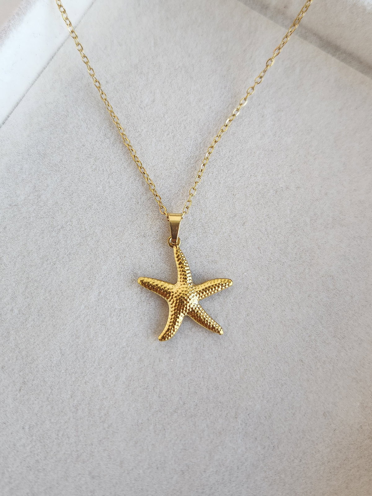 Llevá con vos la esencia del verano y la calma del océano. Nuestro collar Ocean Star presenta un delicado dije de estrella de mar con una textura detallada que captura la luz de manera natural. Realizado íntegramente en acero dorado, es una pieza que combina la frescura de la naturaleza marina con la elegancia del oro.