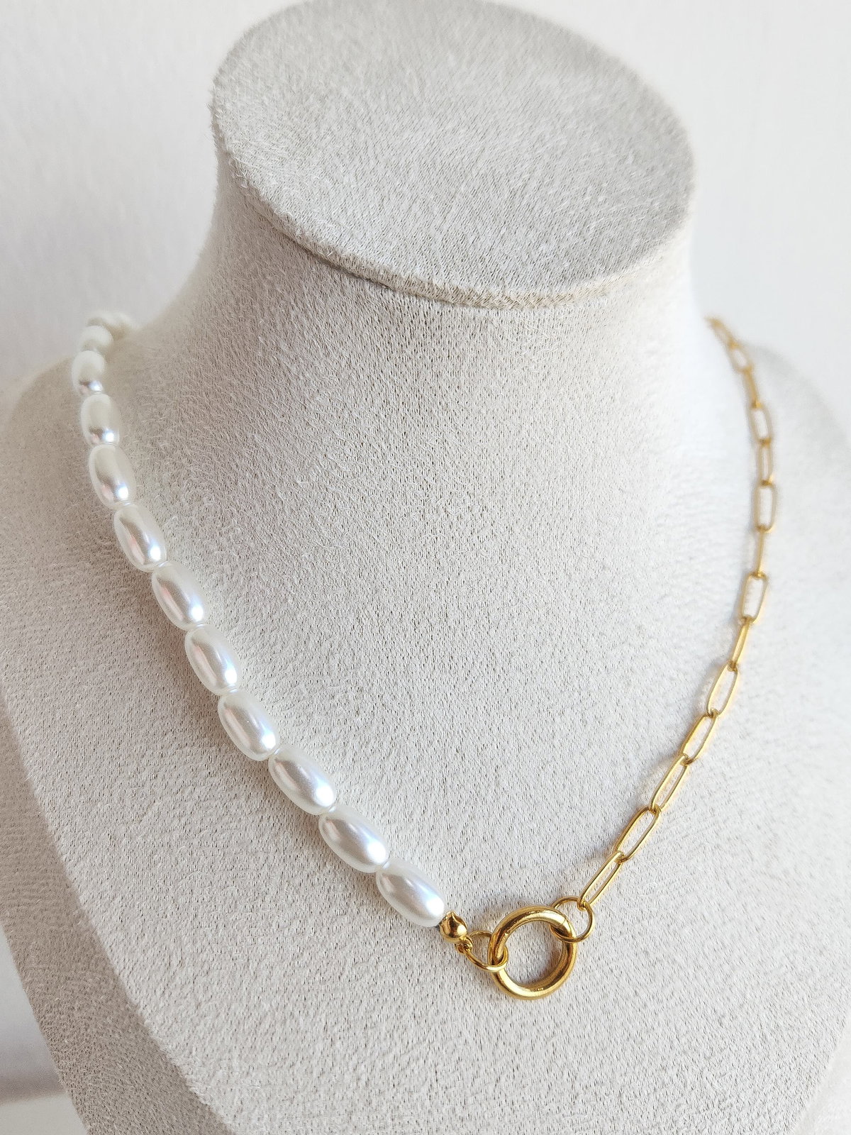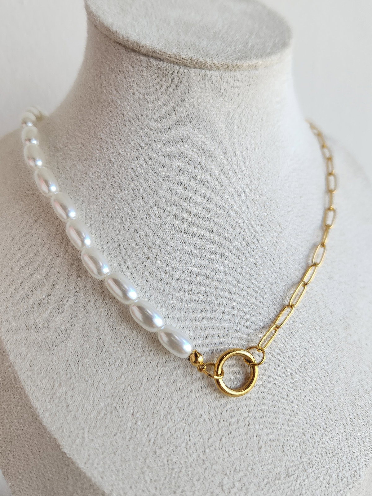 Experimentá el contraste perfecto con nuestro collar Pearlks gold. Este diseño vanguardista presenta una mitad de cadena de acero de eslabones definidos y una mitad de perlas tipo arroz, conocidas por su forma alargada y brillo natural único. Es una pieza que equilibra lo industrial con lo orgánico, ideal para quienes buscan un accesorio con personalidad y diseño de autor.