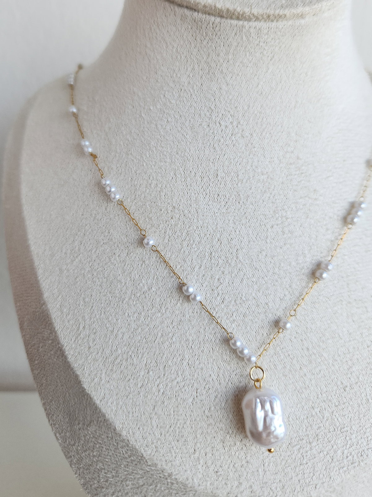 Dije: Perla símil río con forma orgánica, seleccionada por su brillo y textura.