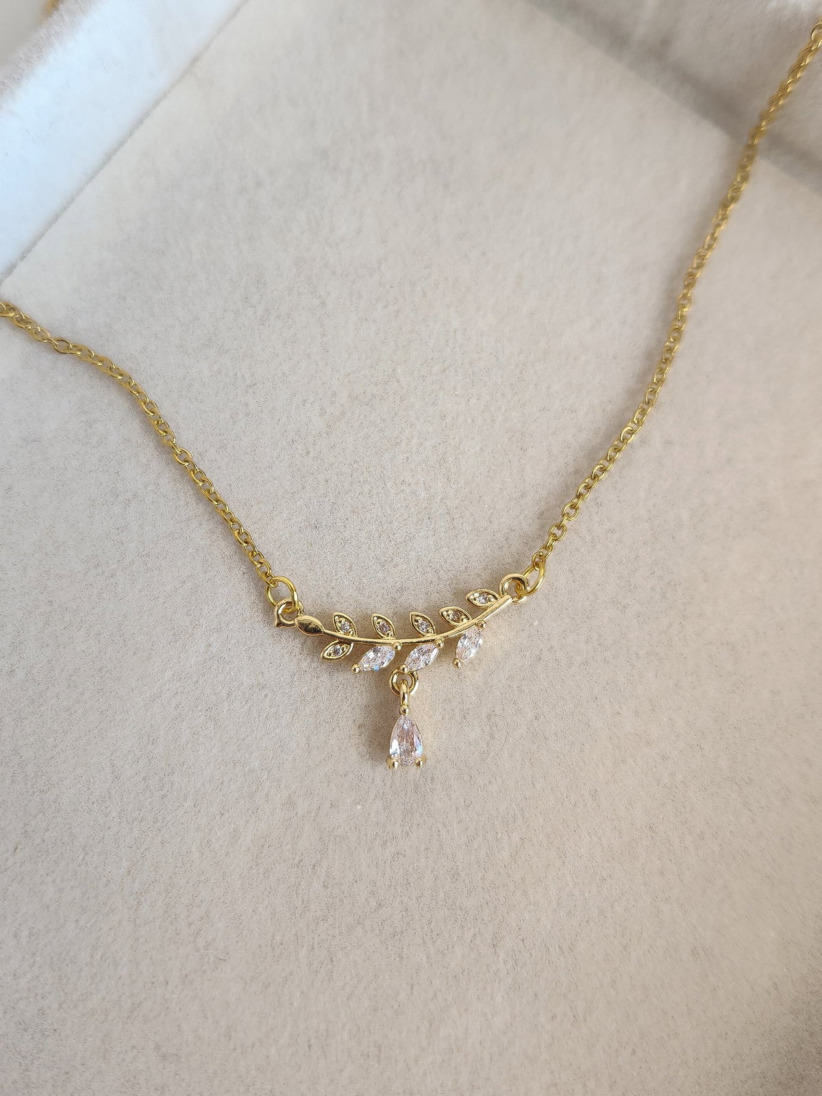 Inspirado en la delicadeza de la naturaleza, nuestro collar Ruma es una joya que derrocha sofisticación. El dije principal presenta una hoja de diseño dual: una mitad está engastada con Cubic Zirconia de corte impecable, mientras que la otra brilla con un delicado pavé de strass. Como detalle final, un mini Cubic colgante cae, simulando una gota de rocío que baila con tu movimiento.