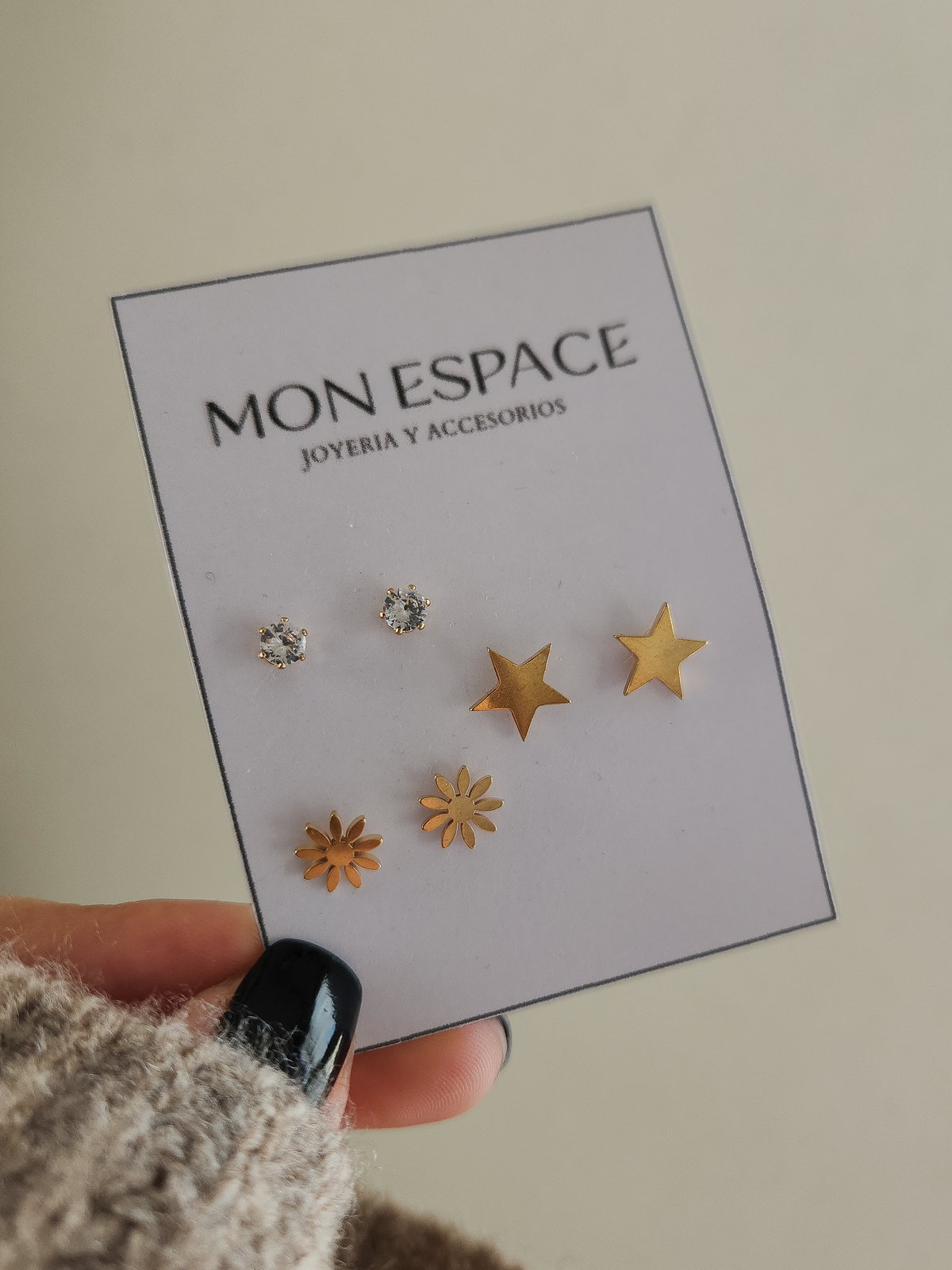 Este trío te permite jugar con tu estilo. Podés usar la flor y la estrella para un look más creativo, o solo los cubics para una elegancia minimalista. Al estar confeccionados en acero dorado, mantienen su color y brillo por mucho más tiempo, siendo resistentes e hipoalergénicos. Es el regalo ideal (o auto-regalo) para quien busca piezas que cuenten una historia y que siempre queden bien juntas.